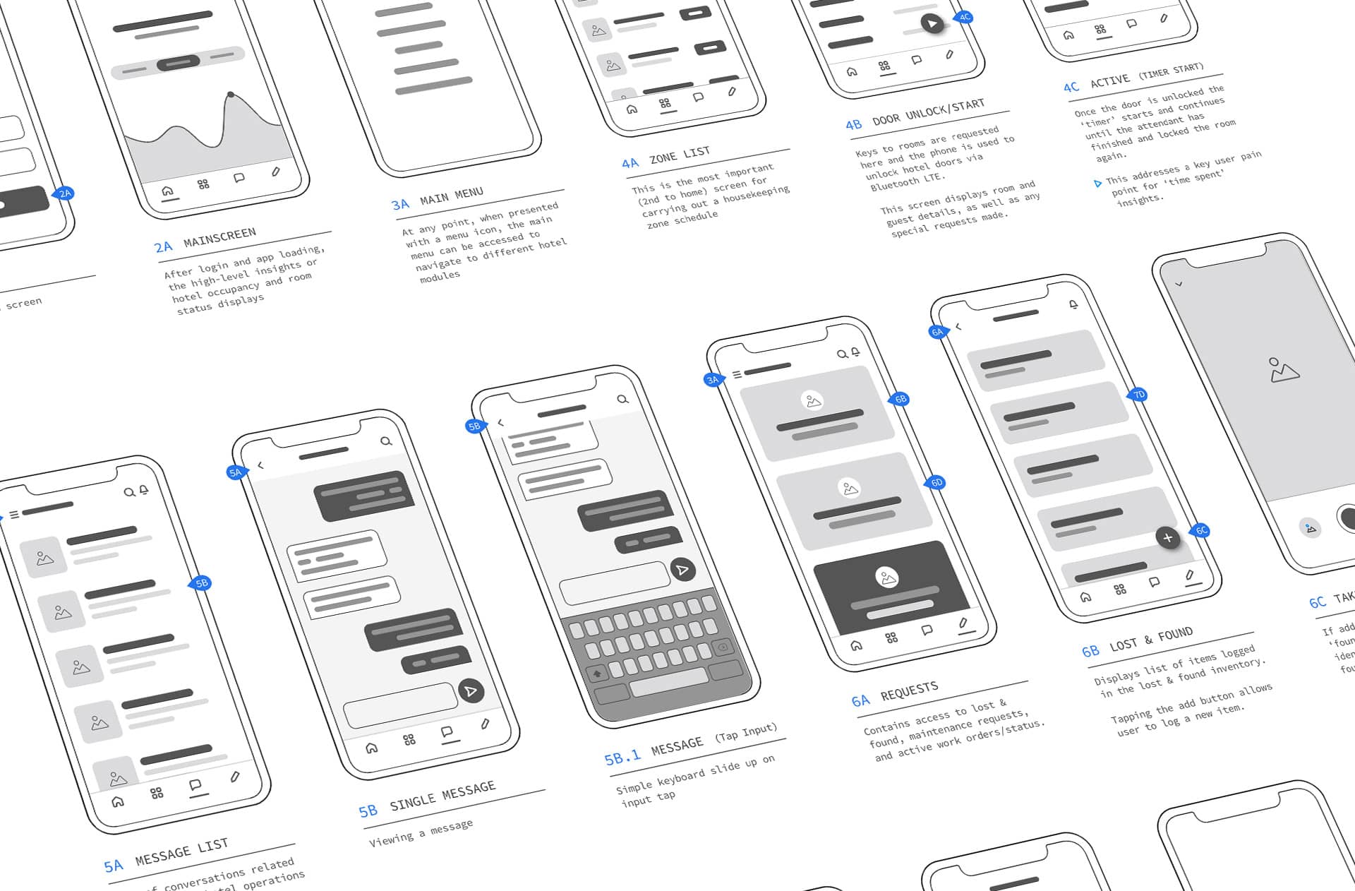 While developing the wireframes, I thought of a feature that could solve the digital key business requirement, as well as some user pain points. By pairing the door unlock feature with a timer, the housekeeping attendants have immediate insights into how long they have spent cleaning any given room. Based on the size of the room and level of cleaning required, they are able to see how much time is usually spent cleaning any given room. Housekeeping managers can also reference this metric in a number of ways to get better insights into day-to-day operations.