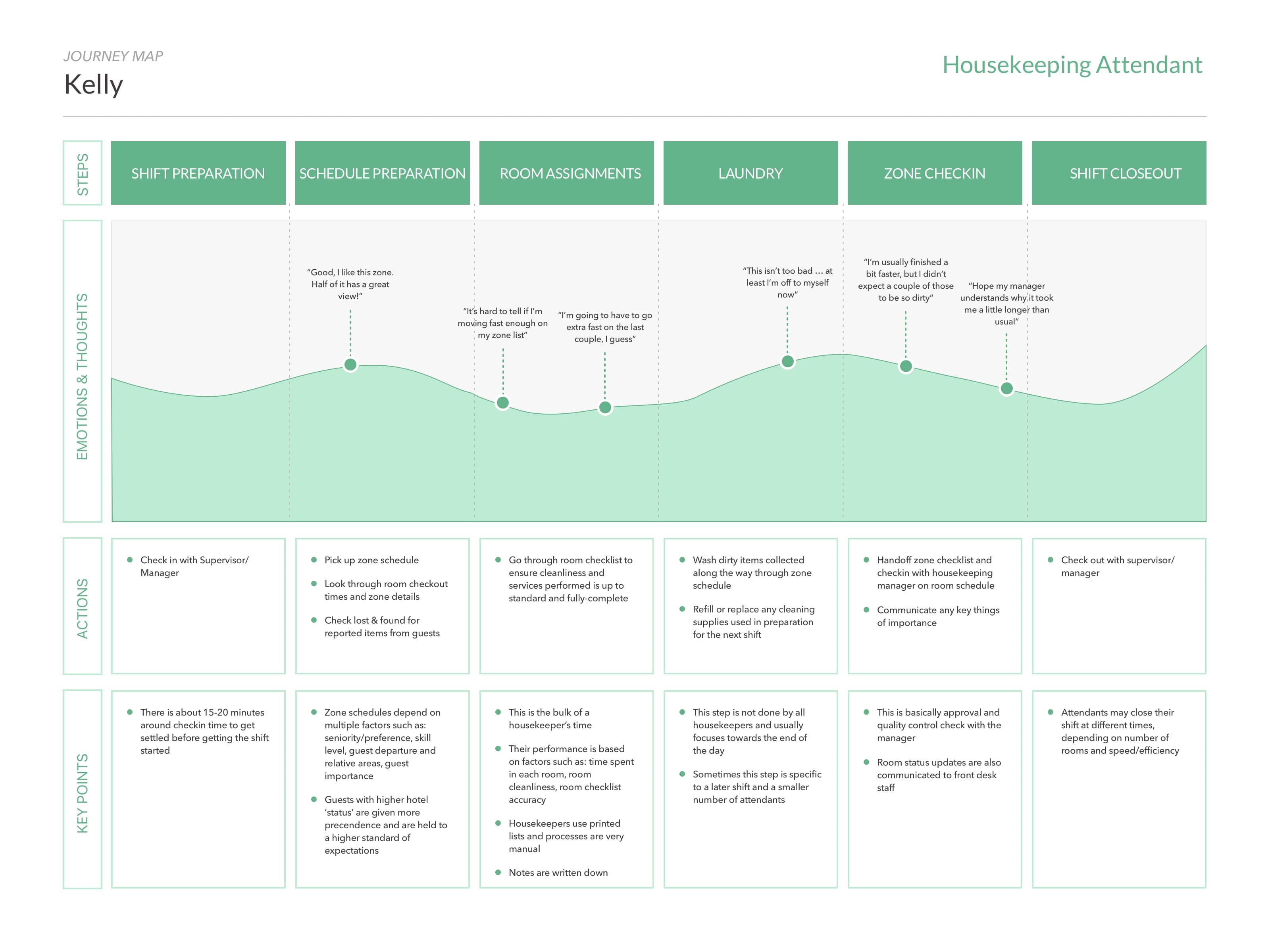 Over the course of the following week, the interviews conducted were consolidated and analyzed to create two user personas: housekeeping manager and housekeeping attendant. We only spoke with one maintenance employee briefly, but their actual workflow was very similar to the attendant.